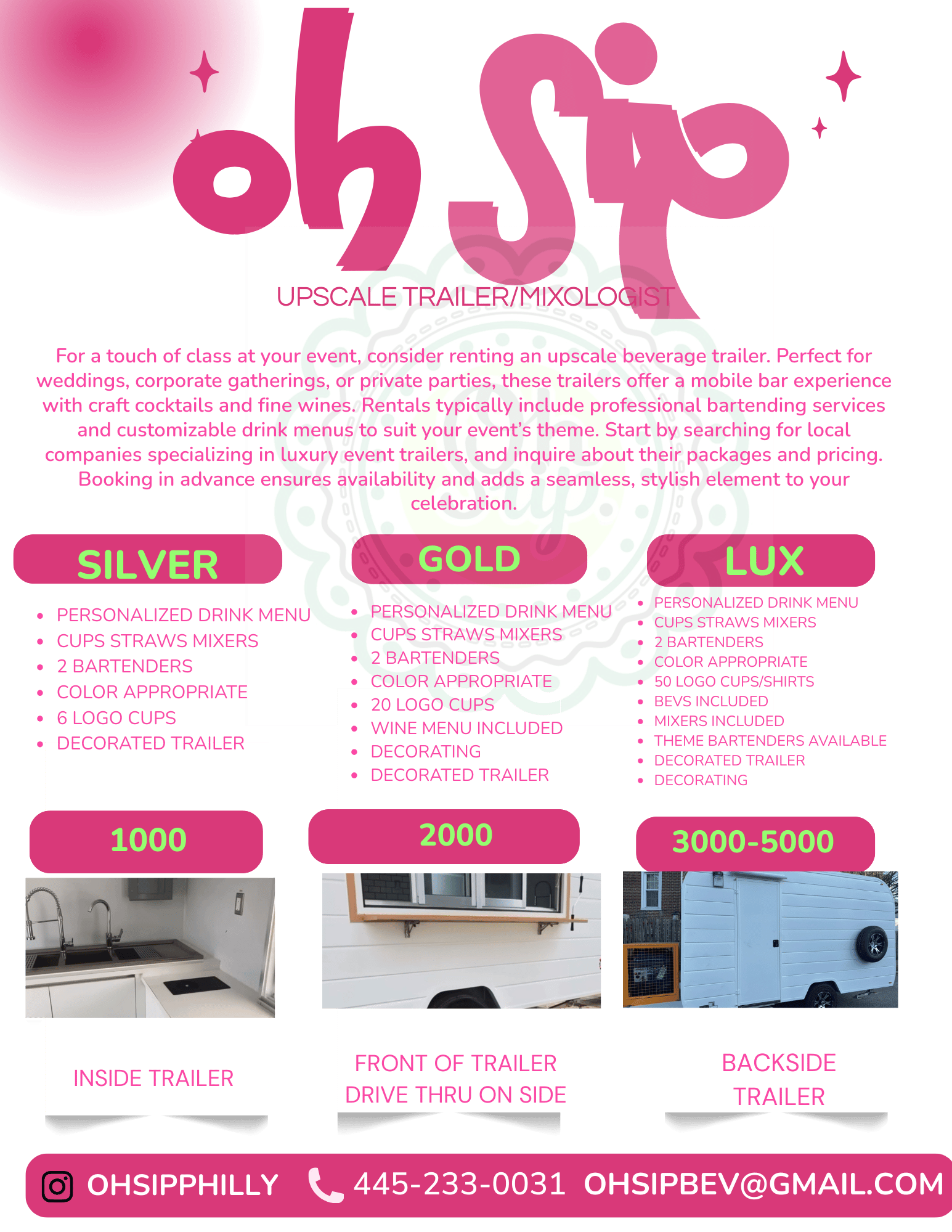 Welcome to Oh Sip, your go-to upscale beverage trailer that's redefining refreshment on the go! We specialize in crafting delicious coffee, invigorating smoothies, creamy slushies milkshakes, and so much more. Perfect for private parties, weddings, or any special event, our mobile café brings delightful sips right to your venue. With a passion for quality and a flair for presentation, Oh Sip ensures an unforgettable beverage experience that keeps your guests coming back for more!